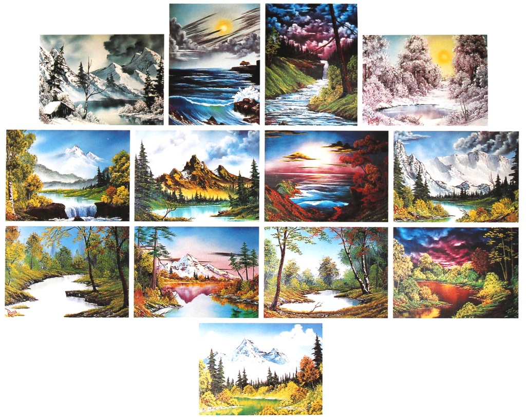 Each of the Joy of Painting books is approximately 76 pages and contains 13 painting projects. The books consist of an Introduction that describes the painting supplies and how they are used, a To The Artist letter from Bob, and step-by-step how-to photos. Also included is a Biography of the artist, Bob Ross.