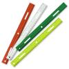 Durable 12″ plastic rulers feature double beveled edge with pencil groove. Raised calibrations show 1/16 inches on one edge, millimeters on the other. Holes allow for storage in ring binders. Clear plastic or assorted colors are available. Rulers are sold individually.
