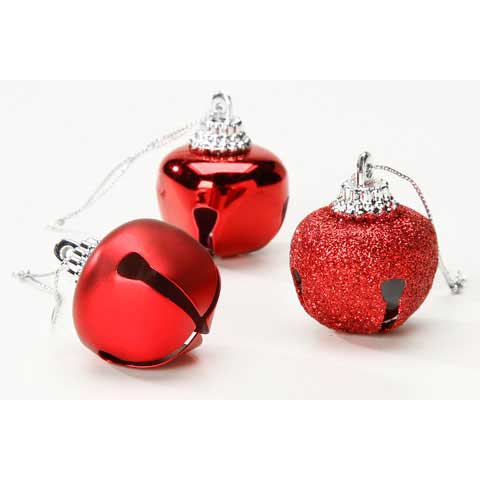 Red jingle bells assorted finishes (glitter and glossy) and a fancy cap. 30mm x 40mm 21 pieces per package.