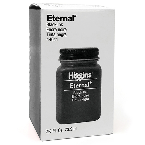 Eternal Black is a carbon based pigment ink that is archival and ideal for projects you hope to keep for years to come. Ink will not fade or cause discoloration to your paper. This black ink can be used with a dip pen, brush and fountain pen. It works best on paper, board, and film. It will also dry completely flat and comes in a 2.5 ounce bottle.