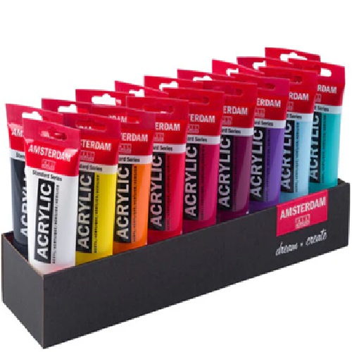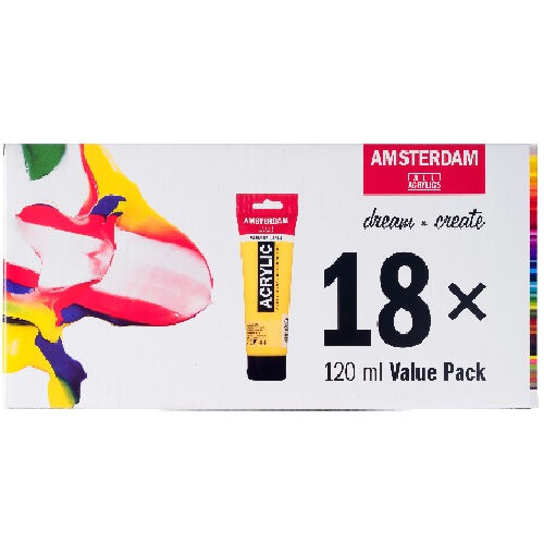 Contents: 18 x 120 ml tubes (105 Titanium White – 275 Primary Yellow – 276 Azo Orange – 315 Pyrrole Red – 369 Primary Magenta – 567 Permanent Red Violet – 507 Ultramarine Violet – 551 Sky Blue Light – 661 Turquoise Green – 504 Ultramarine – 572 Primary Cyan – 566 Prussian Blue (Phthalo) – 623 Sap Green – 227 Yellow Ochre – 409 Burnt Umber – 411 Burnt Sienna – 718 Warm Grey – 735 Oxide Black).
