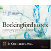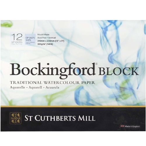 St Cuthbert’s Bockingford Watercolor Glue bound Block contain 12 sheets of acid-free, 140 lb (300 gsm) paper that is internally sized for enhanced durability. Traditionally made on a cylinder mould machine using pure materials at historic St. Cuthbert’s Mill in the southwest of England, these heavyweight sheets feature a distinctive textured surface that is achieved through the incorporation of natural woolen felts. Pads are glued on the long edge.