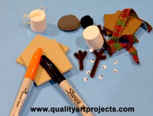 Materials: Craft Foam Marshmallows (can purchase from Quality Art) (you can use real marshmallows but they wont last between years), Thick Craft foam (tan and brown), Sharpie or other marker (orange, black), wiggle eyes, craft glue, brown chenille stems, scissors, optional- black pom poms, ribbon or fabric, and back construction paper.