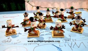 Directions: Start off by gluing your eyes and drawing your face on your snowman- do this with your sharpie or maker, once you have your face on you can start assembling. Glue all of your pieces together, poke small holes in the bottom marshmallow for the chenille stems to go into. lastly glue on your hat if you chose to put one on.
